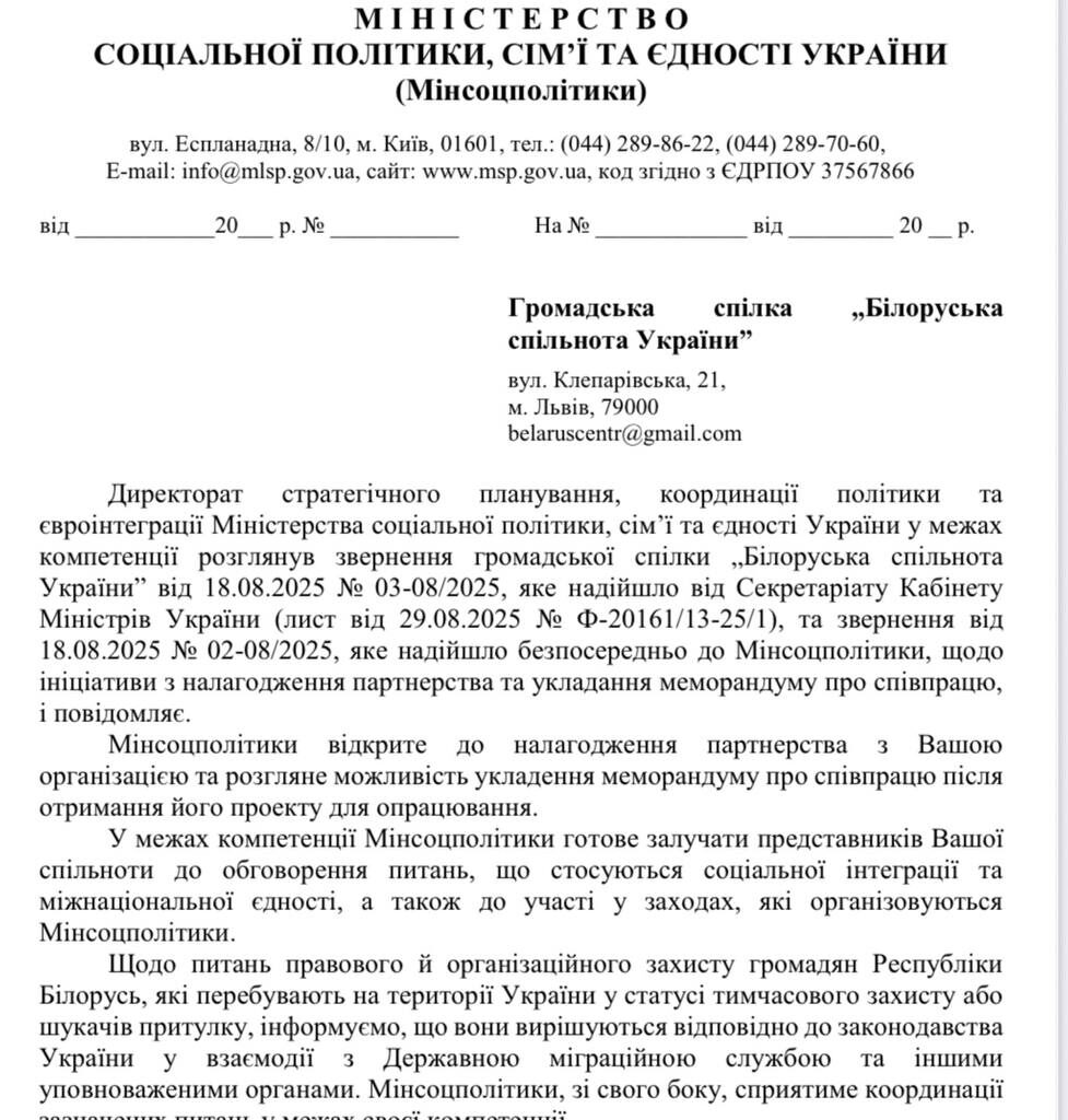Шчыра дзякуем Міністэрству сацыяльнай палітыкі, сям’і і еднасці Украіны за адкрытасць да супрацоўніцтва і гатоўнасць да дыялогу з нашай супольнасцю.